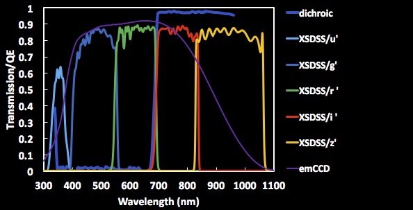 Filter Wheel A Centeral λ, bandwidth Filter Wheel B Central λ, bandwidth SDSS/u 354.3nm, 32.7nm SDSS/i 765.4nm, 146.4nm SDSS/g 480nm, 151.1nm SDSS/z 943.3nm, 242.7nm SDSS/r 620nm, 143.5nm 716 716nm, 51.5nm 467 467.1nm, 44nm 832 832nm, 40.4nm 562 562.3nm, 43.6nm