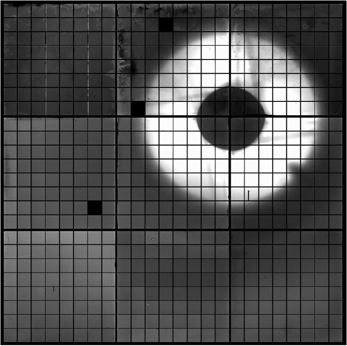 Pupil Ghost - Reflections between the filters and the Dewar window result in pupil ghosts in some images. These ghosts are different depending on which level (1, 2, or 3) a given filter is in. Generally, the ghost is only significant for filters in layer 2 (see image of science field). In layers 1 and 3 it is much more diffuse and out of focus. It also depends on the filter. The layer 2 pupil ghost has an intensity of about 10% in g, 4.5% in r and z, and 0.5% in i. The ghost is removed by dividing the flat field by a template of the pupil ghost illumination pattern, and by subtracting a scaled template from the science observations.
