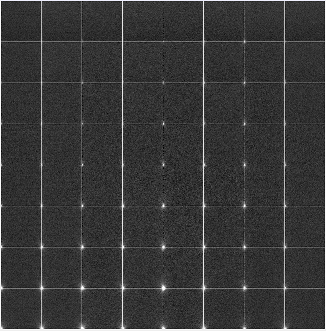 In addition to the amplifiers, there are two transistors associated with each cell that glow. The image below is a 1200 second dark, showing a number of cosmic rays in addition to the glowing transistors. Although these glows look bright, they are swamped by the sky in a broad band exposure. They are quite effectively removed by subtracting a dark frame.